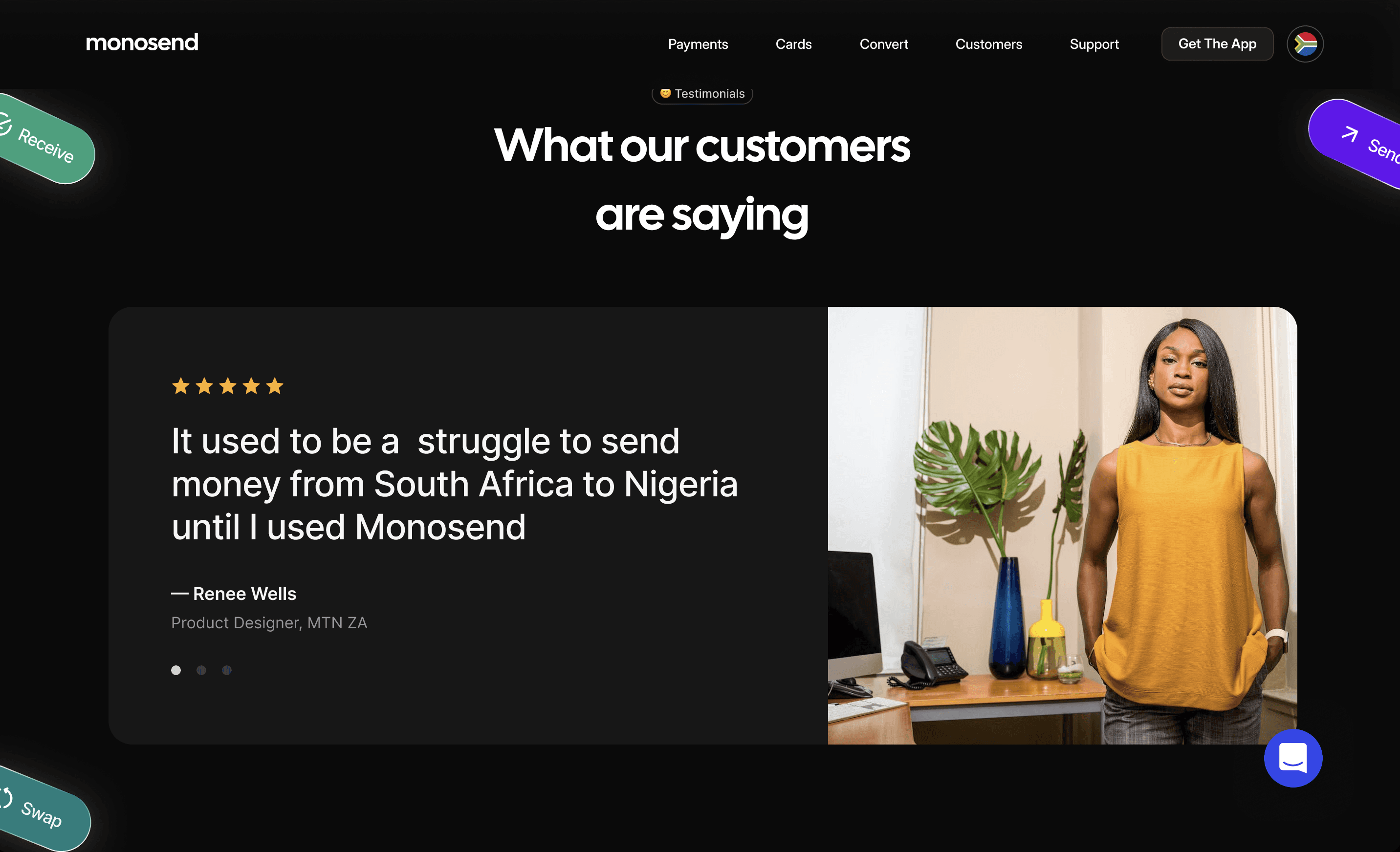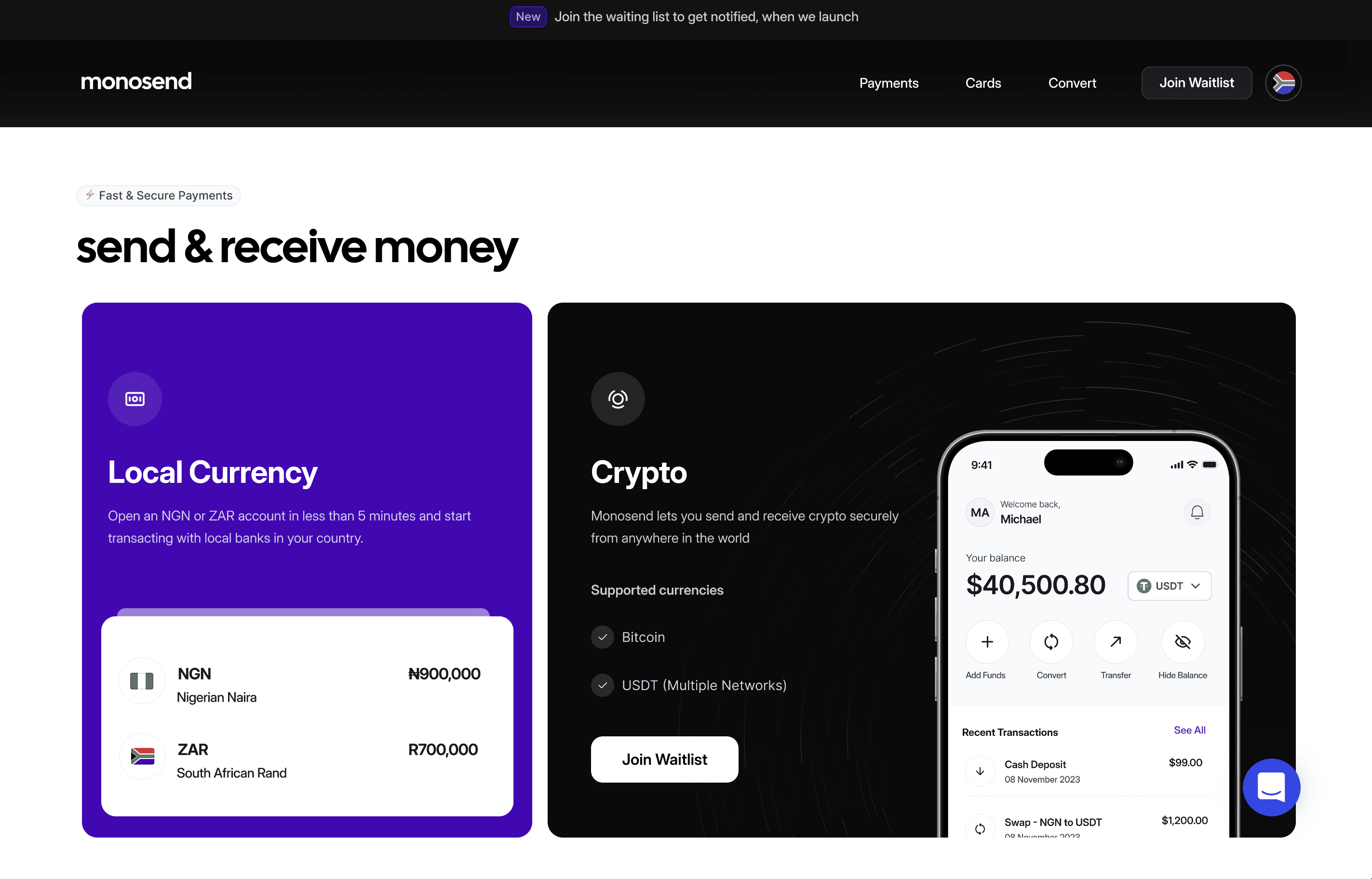 Fiat Transfers: Seamlessly send and receive funds (e.g., Naira ↔ Rand) with upfront fee and rate visibility.