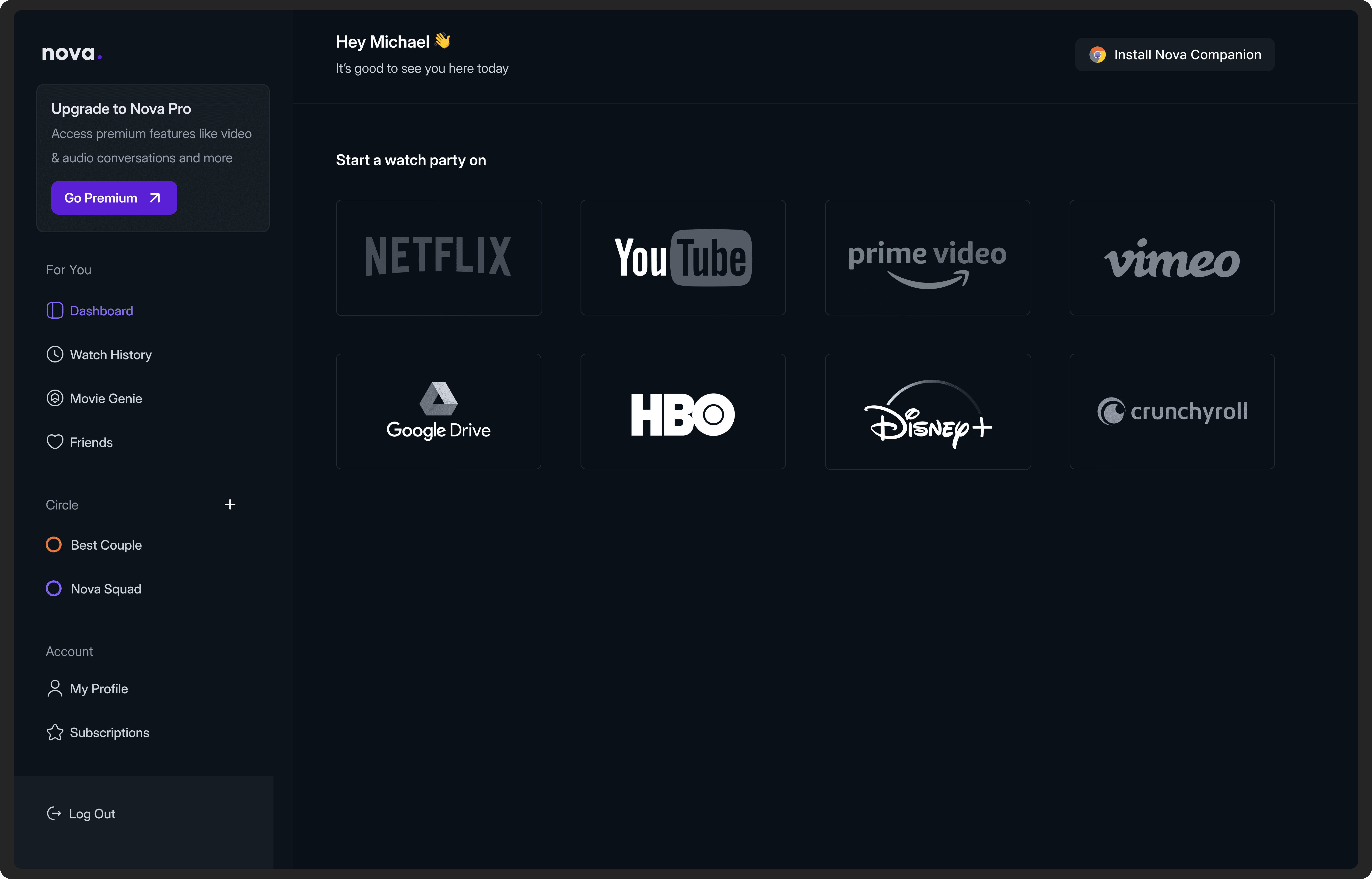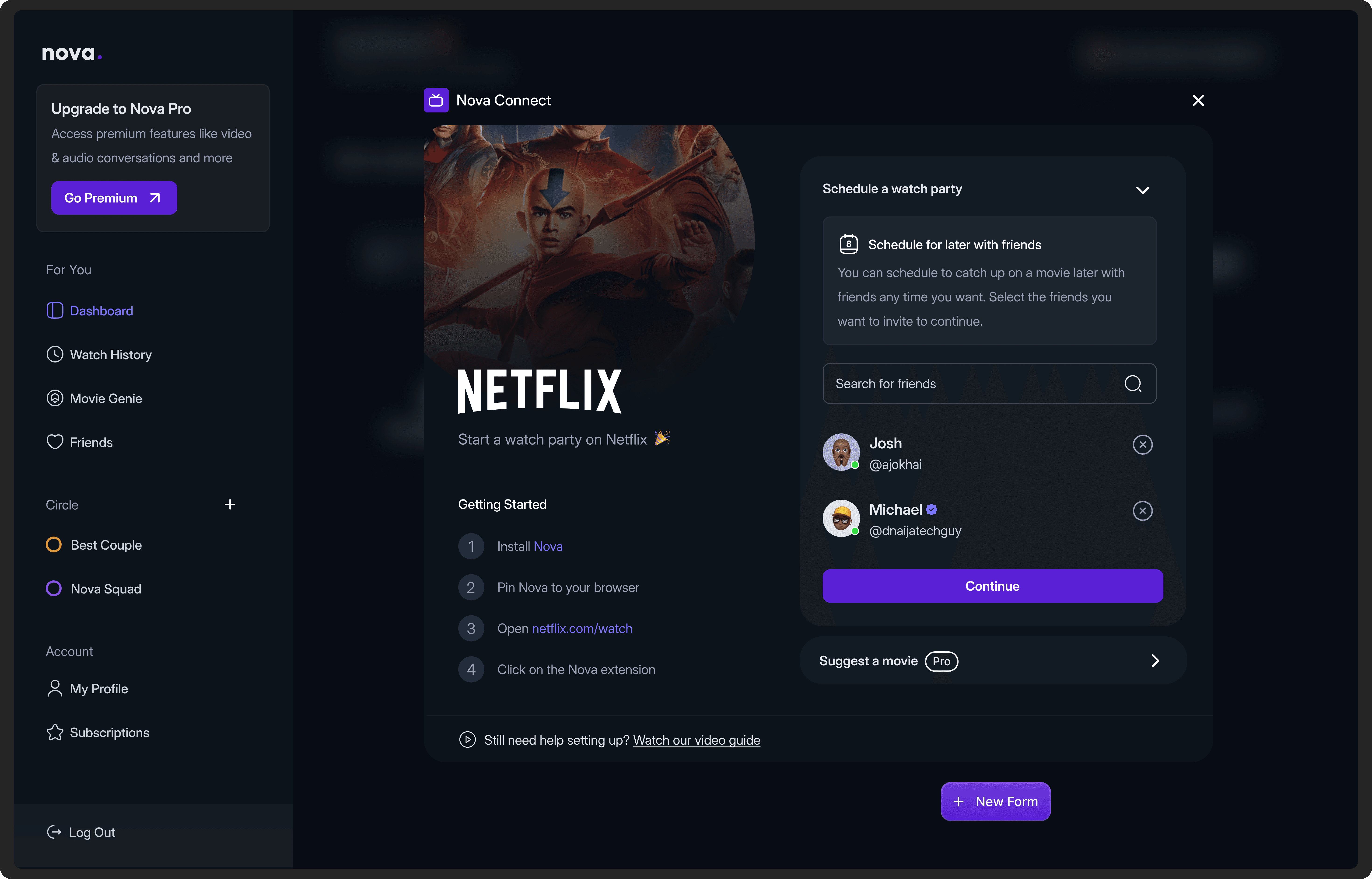 Nova is a personal project I designed and also actively developing using Cursor AI & Claude. The extension lets users watch movies with friends directly from their browser using this extension. It also tracks movies that are watched by users